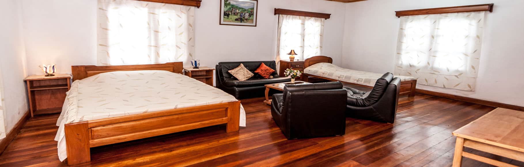 La maison dispose de 12 chambres avec sanitaires privatifs (douches, toilettes, eau chaude), réparties dans la maison principale et dans une maisonnée indépendante avec quatre chambres. Chaque chambre révèle une personnalité particulière, décorée de manière sobre mais soignée avec des tableaux peints par des artistes malgaches et des objets de l’artisanat local. Les chambres sont équipées d’un lit double ou de lits jumeaux, mais il est possible d’ajouter un lit supplémentaire simple.